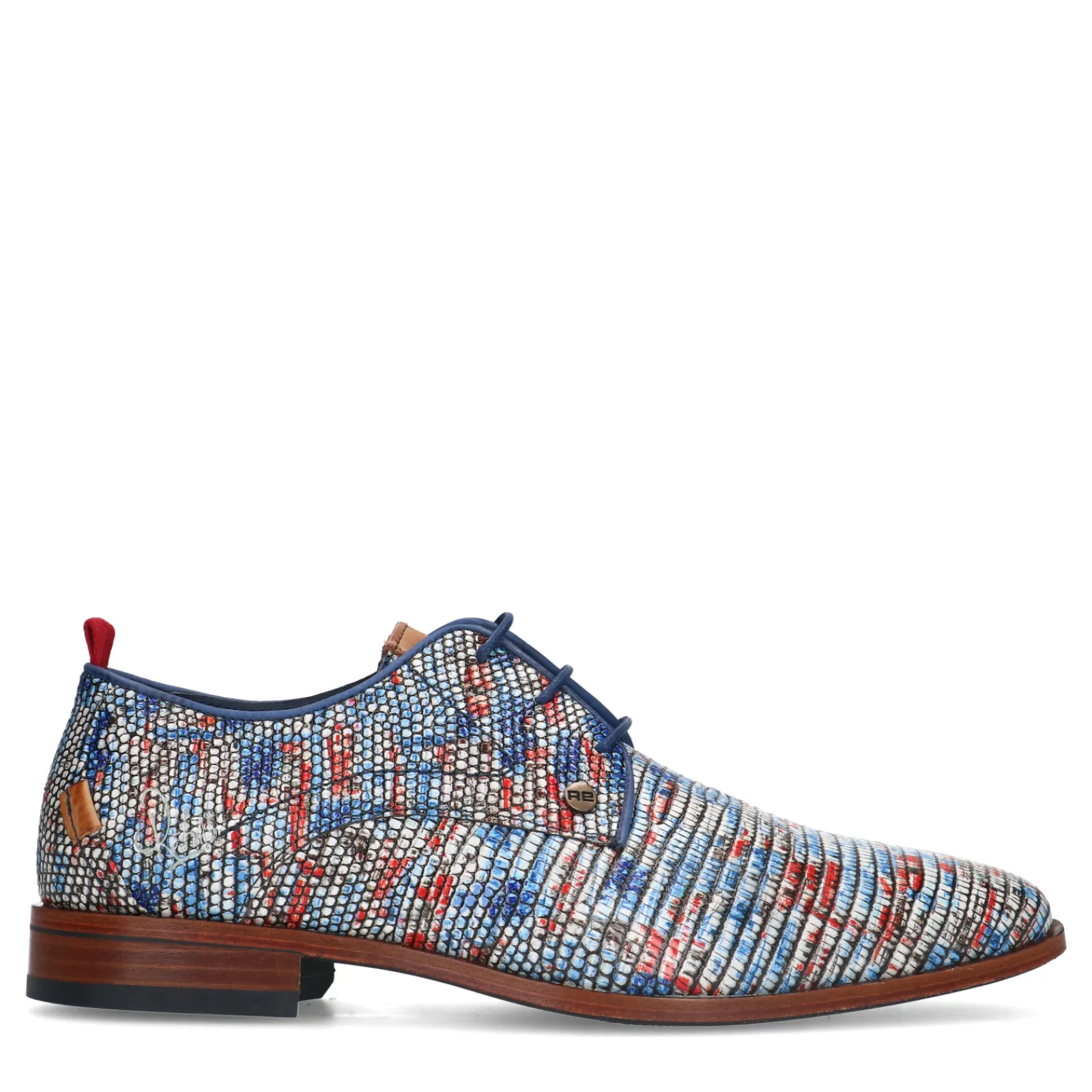 Blauw-Rode Multicolor Veterschoenen Van Rehab. De Veterschoenen Hebben Een Gedetailleerd Patroon Met Multicolor Favela Geinspireerde Print. De Schoenen Hebben Een Puntvormige Neus En Blauwe Veters Met Een Bruine Zool. De Schoenen Zijn Aan De Binnen- En Buitenkant Gemaakt Van Leer. Maak Gebruik Van De Juiste Onderhoudsproducten!