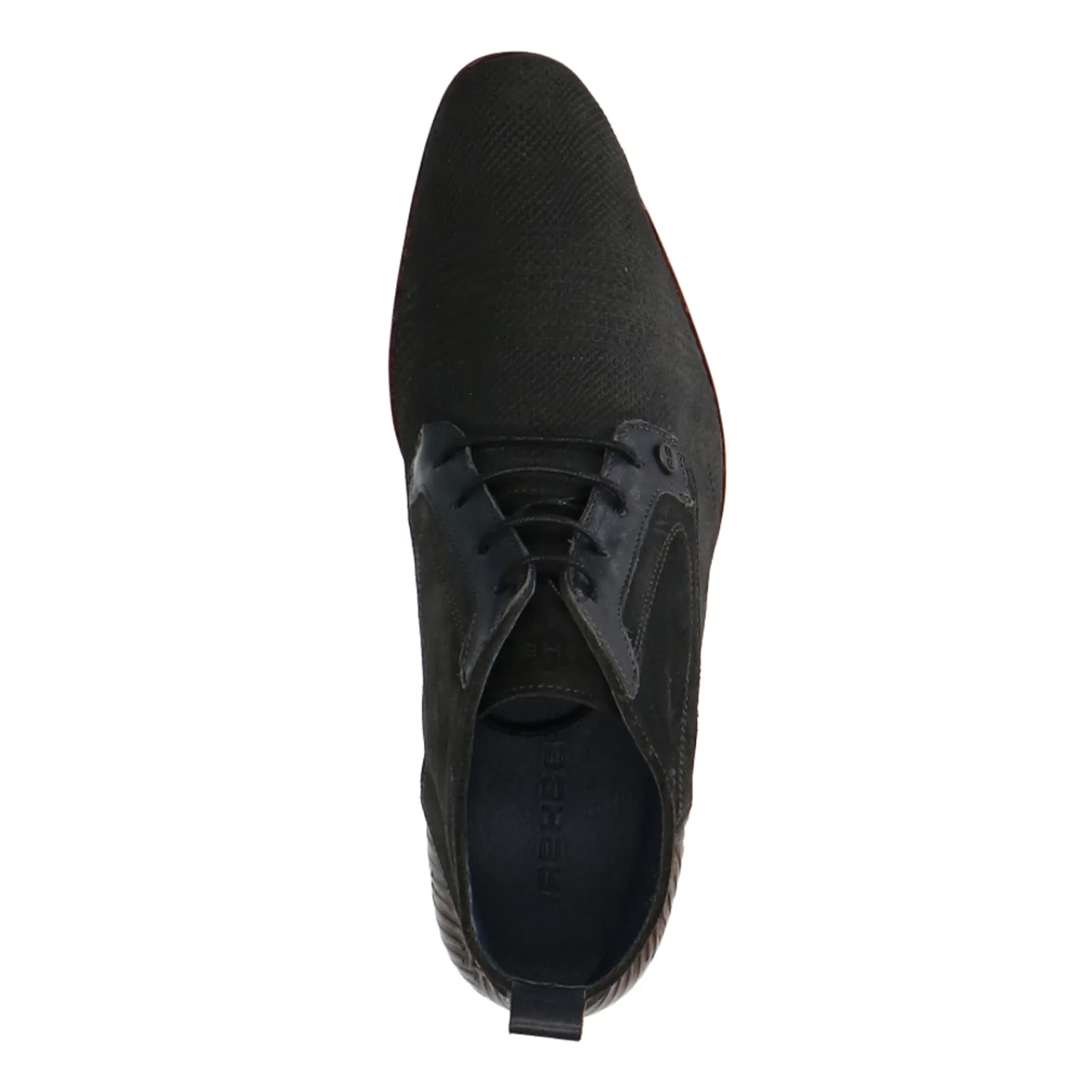 Donkerblauwe Halfhoge Veterschoenen Met Subtiele Print En Bruine Hielcap Van Het Merk Rehab. De Veterschoenen Zijn Aan De Buitenzijde Gemaakt Van Leer En Suede En Aan De Binnenzijde Van Leer. Maak Gebruik Van De Juiste Onderhoudsproducten!