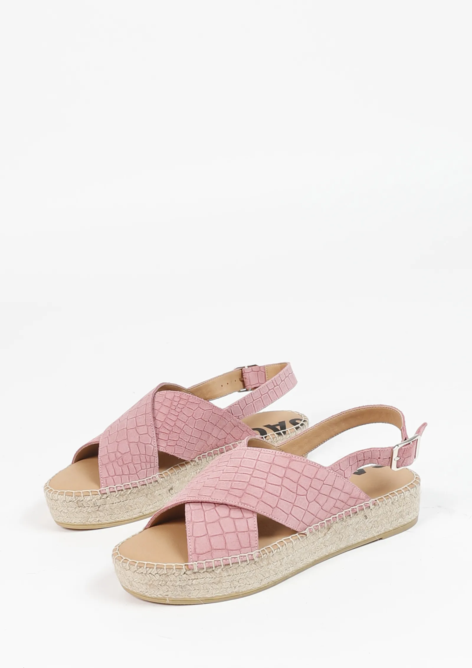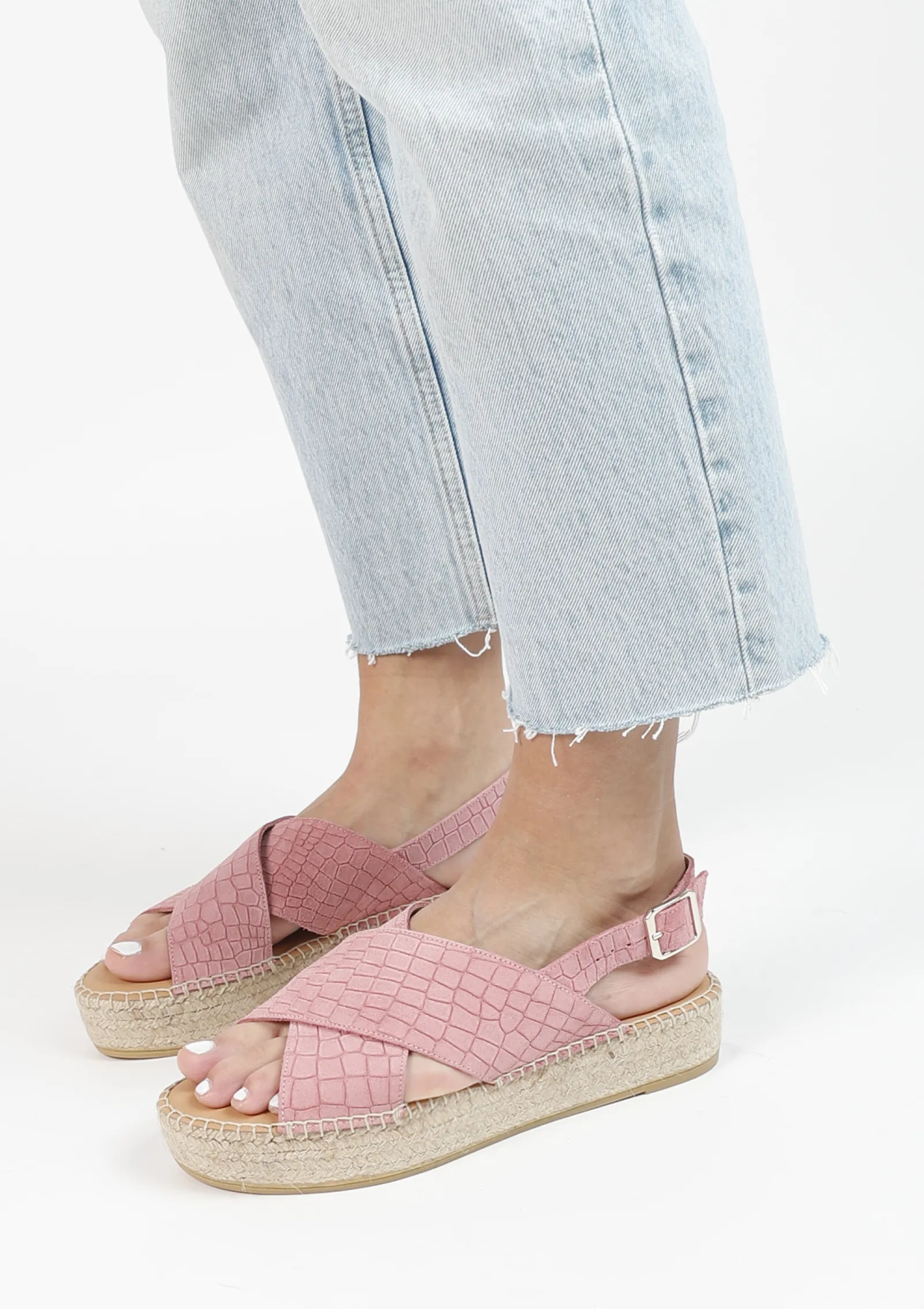 Summer Ready Met Deze Roze Suede Plateau Sandalen Van Sacha! De Sandalen Zijn Aan De Buitenzijde Gemaakt Van Suede En Aan De Binnenzijde Van Leer. De Plateau Zool Is Gemaakt Van Gewoven Touw Met Een Hoogte Van 4 Cm. Het Design Heeft Een Subtiele Croco Print Voor Een Unieke Twist. Maak Gebruik Van De Juiste Onderhoudsproducten!
