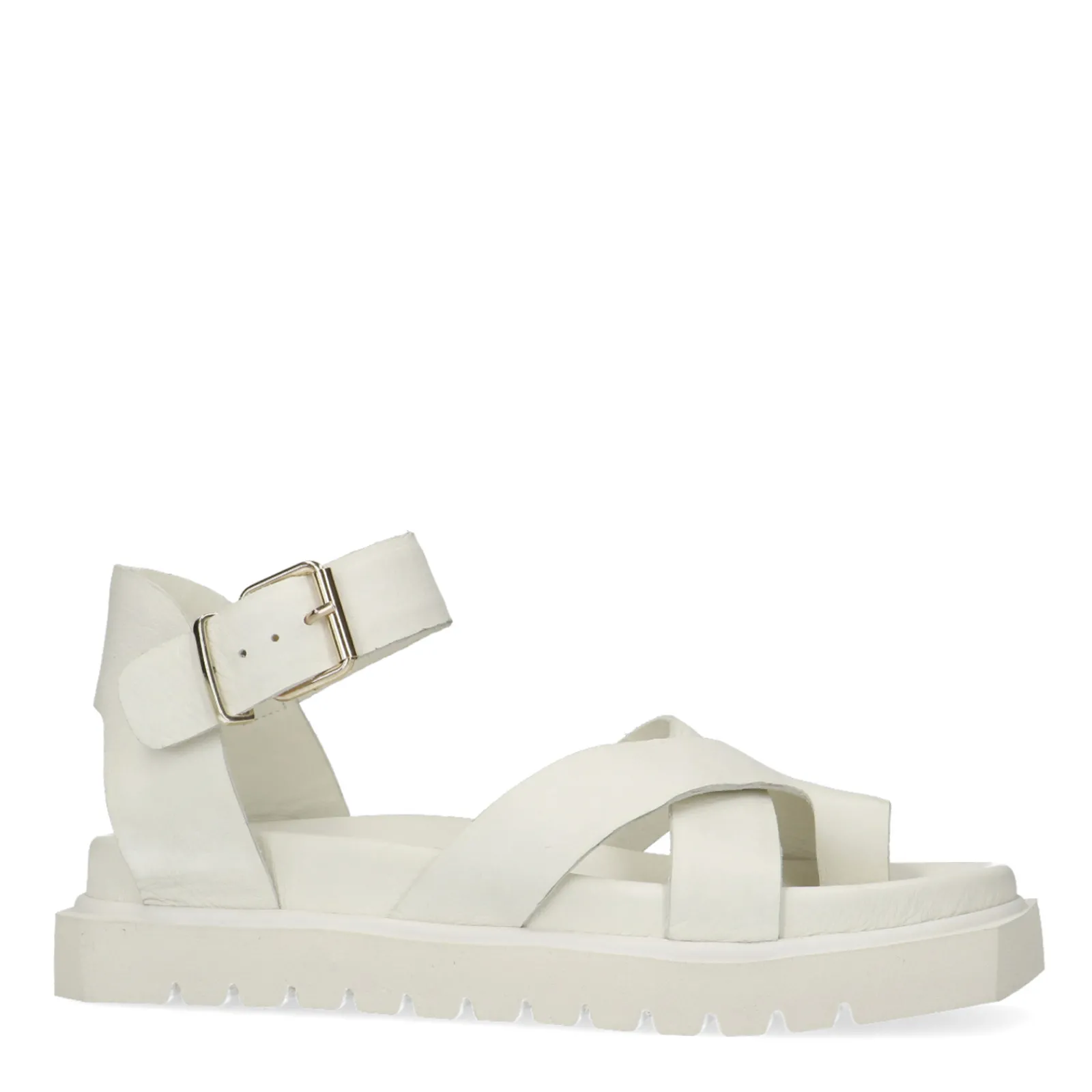 Deze Plateau Sandalen Van Sacha Zijn Trendy En Stoer. Het Witte Leer, De Gekruiste Band En De Gespband Met Goudkleurige Sluiting Zijn Opvallende Kenmerken. De Plateauzool Is 4 Cm Dik. Onderhoud Je Sandalen Met De Juiste Onderhoudsproducten.