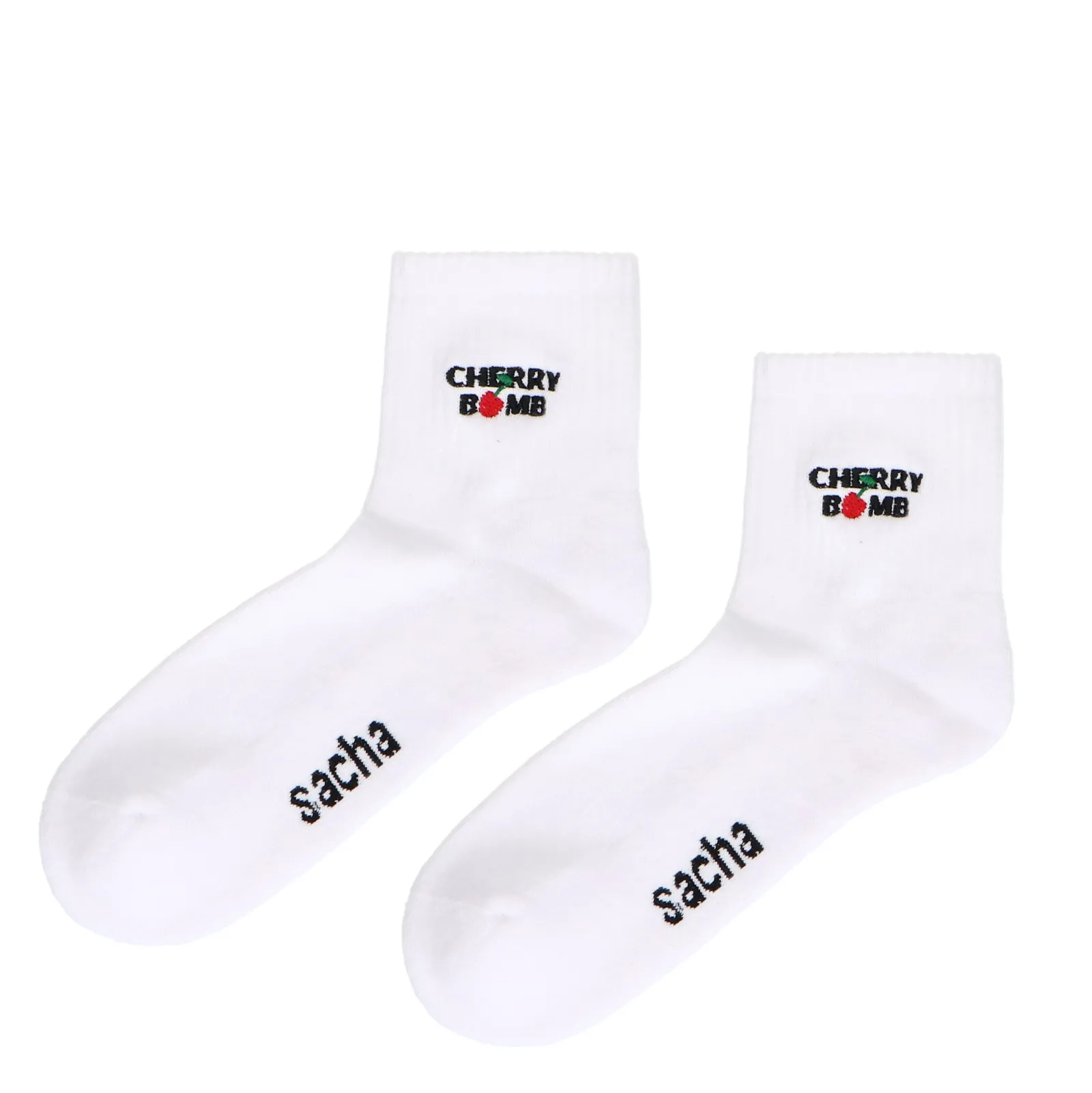 Deze Witte Sportsokken Van Sacha Hebben Een Unieke En Sportieve Look. De ‘Cherry Bomb’ Tekst Aan De Bovenkant Geeft Jouw Sporty Look Een Vrolijke Toevoeging. De Sokken Zijn One Size.