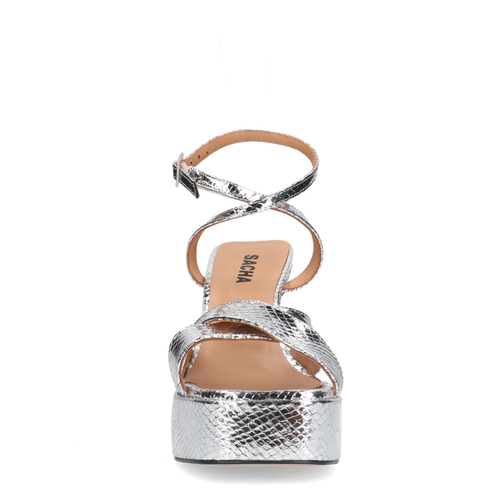 Deze Zilverkleurige Metallic Platform Sandalen Met Hak Van Sacha Zijn Een Musthave Deze Zomer! De Zilverkleurige Metallic Finish En Het Subtiele Design Maken De Heeled Sandals Echte Eyecatchers. De Platform Sandalen Hebben Een Zooldikte Van 4 Cm Dik En Een Trechter Hak Met Een Hoogte Van 12 Cm. Over De Voet Lopen Twee Gekruiste Bandjes En De Sandalen Sluiten Middels Een Enkelbandje Met Gespsluiting. De Sandalen Met Hak Zijn Geheel Gemaakt Van Leer. Maak Gebruik Van De Juiste Onderhoudsproducten!