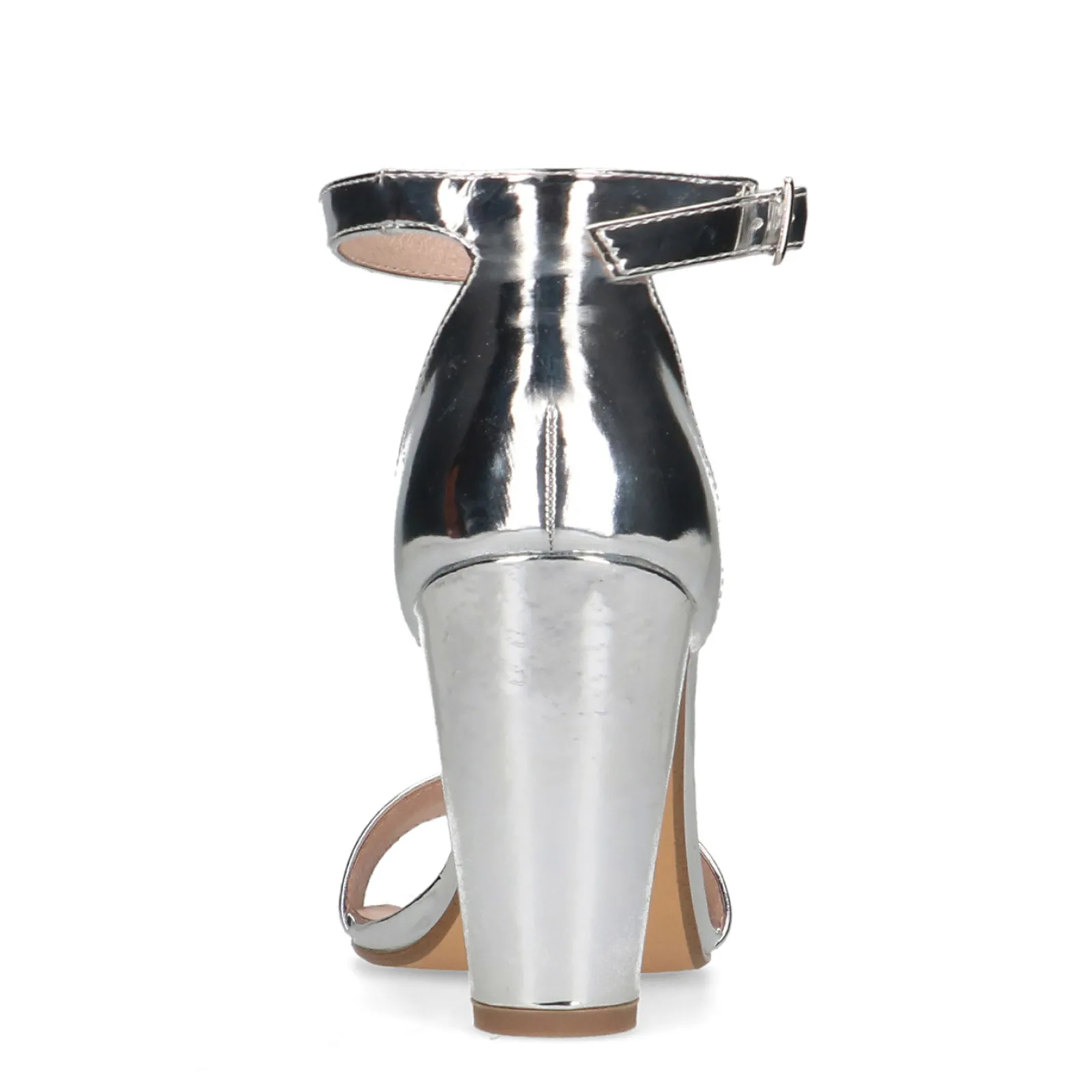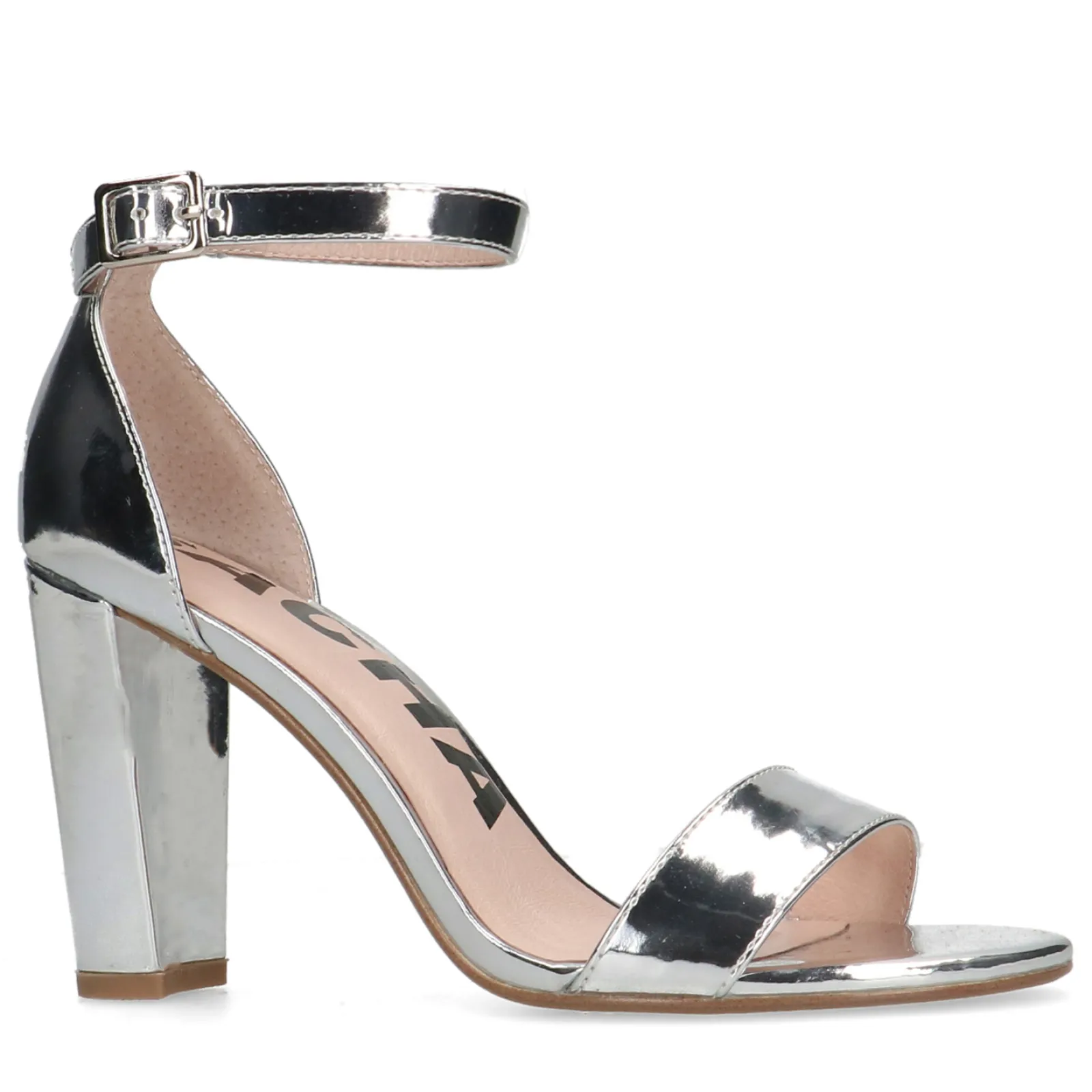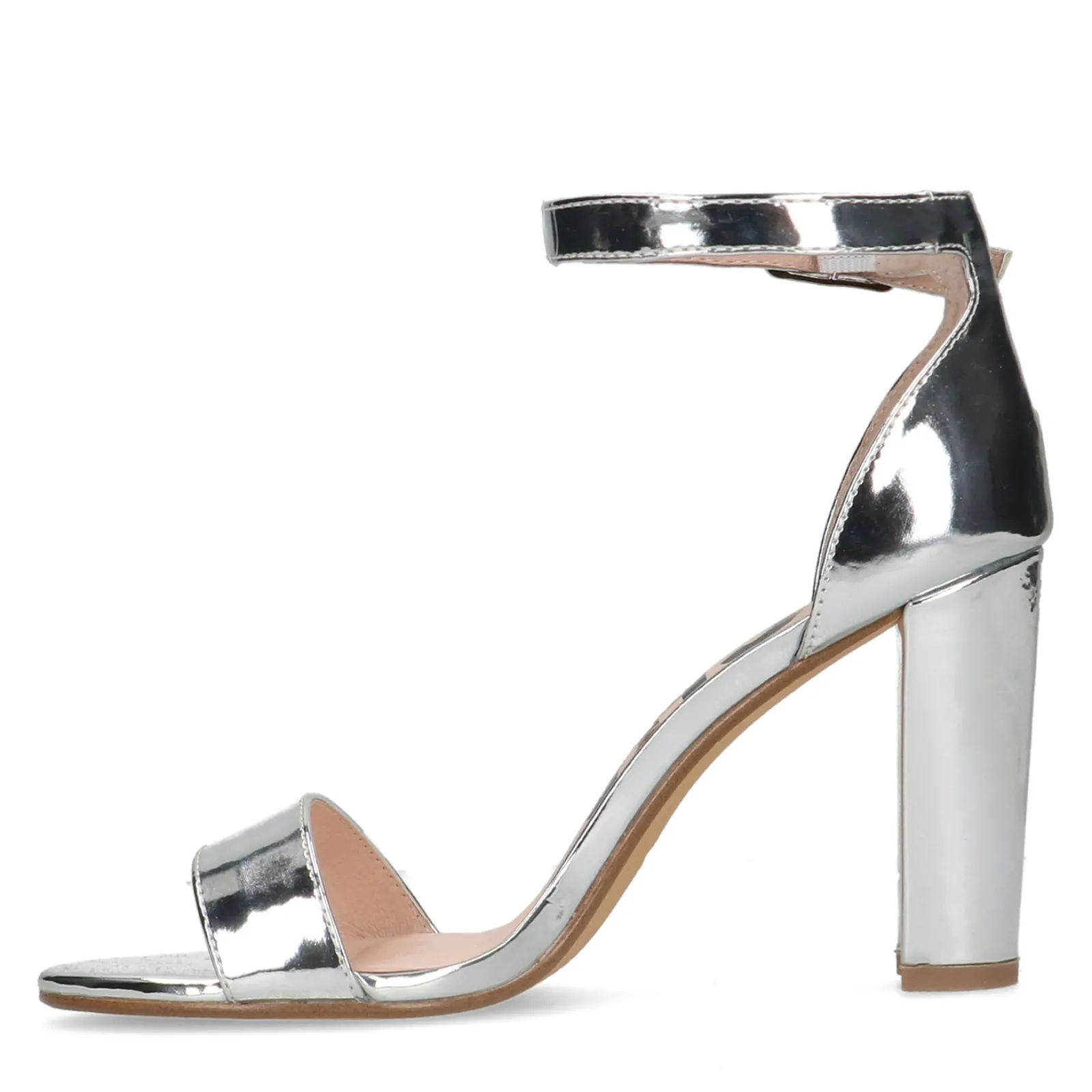 Prachtige Zilverkleurige Sandalen Met Hak Van Sacha! De Haksandalen Zijn Gemaakt Van Een Metallic Lakleer-Finish, De Trend Van Dit Moment. De Hakhoogte Is 9 Cm En De Hak Is Iets Breder Wat Voor Extra Loopcomfort Zorgt. Maak Gebruik Van De Juiste Onderhoudsproducten.