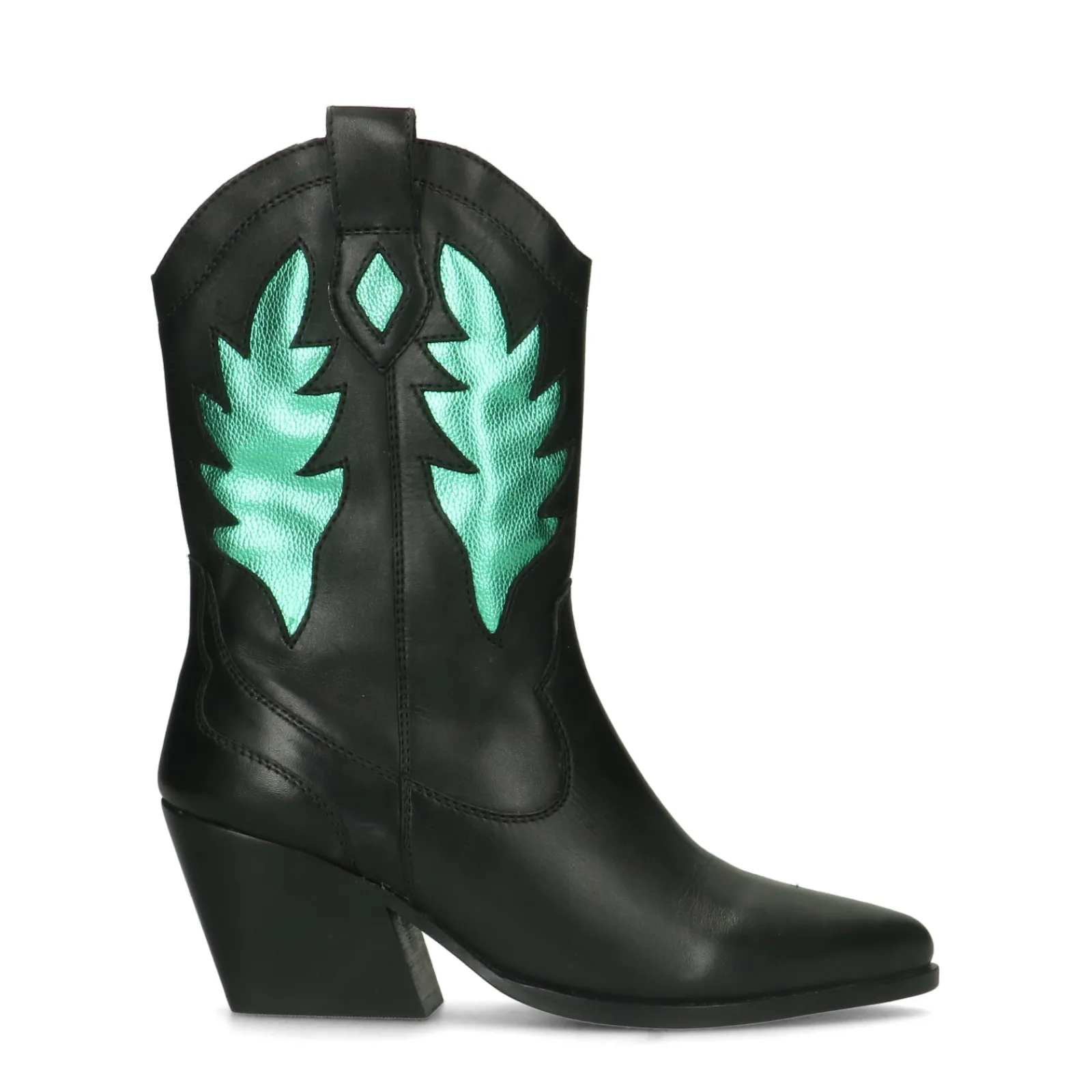 Zwarte Cowboy Enkellaarsjes Met Metallic Groene Details^Sacha Best