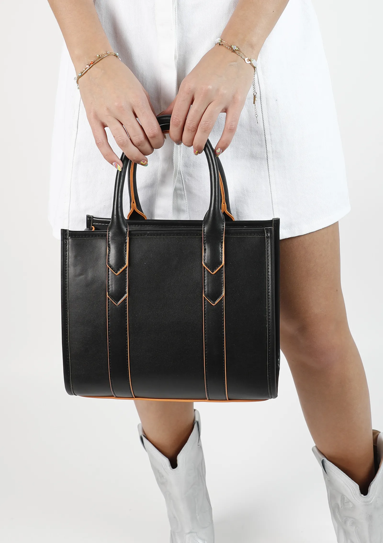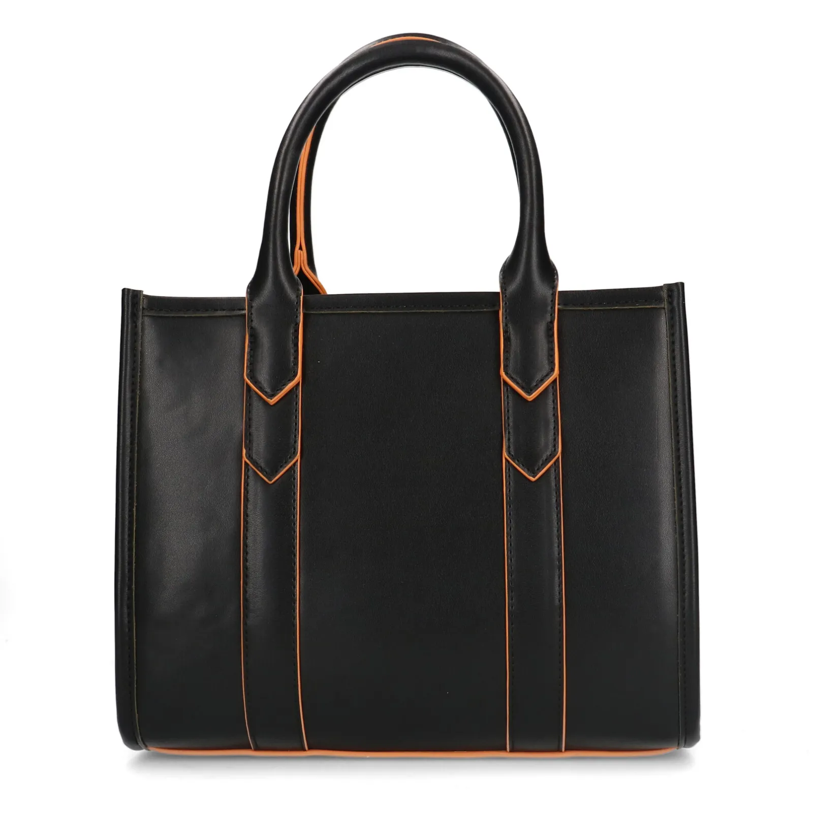 Ga Voor Een Statement Look Met Deze Trendy Zwarte Handtas Van Sacha! De Tas Heeft Een Basic Look Met Opvallende Maar Subtiele Oranje Details. Over De Tas Lopen Zwarte Gestikte Details Met Zwarte Handvaten Gecombineerd Met Een Optionele Verstelbare Schouderband. De Schouderband Heeft Een Lengte Van 97 Cm En De Tas Heeft Een Totale Afmeting Van 18X18X6 Cm (Hxbxd). De Handtas Heeft Een Klein Insteekvakje Aan De Binnenzijde En Sluite Middels Een Rits. Maak Gebruik Van De Juiste Onderhoudsproducten!