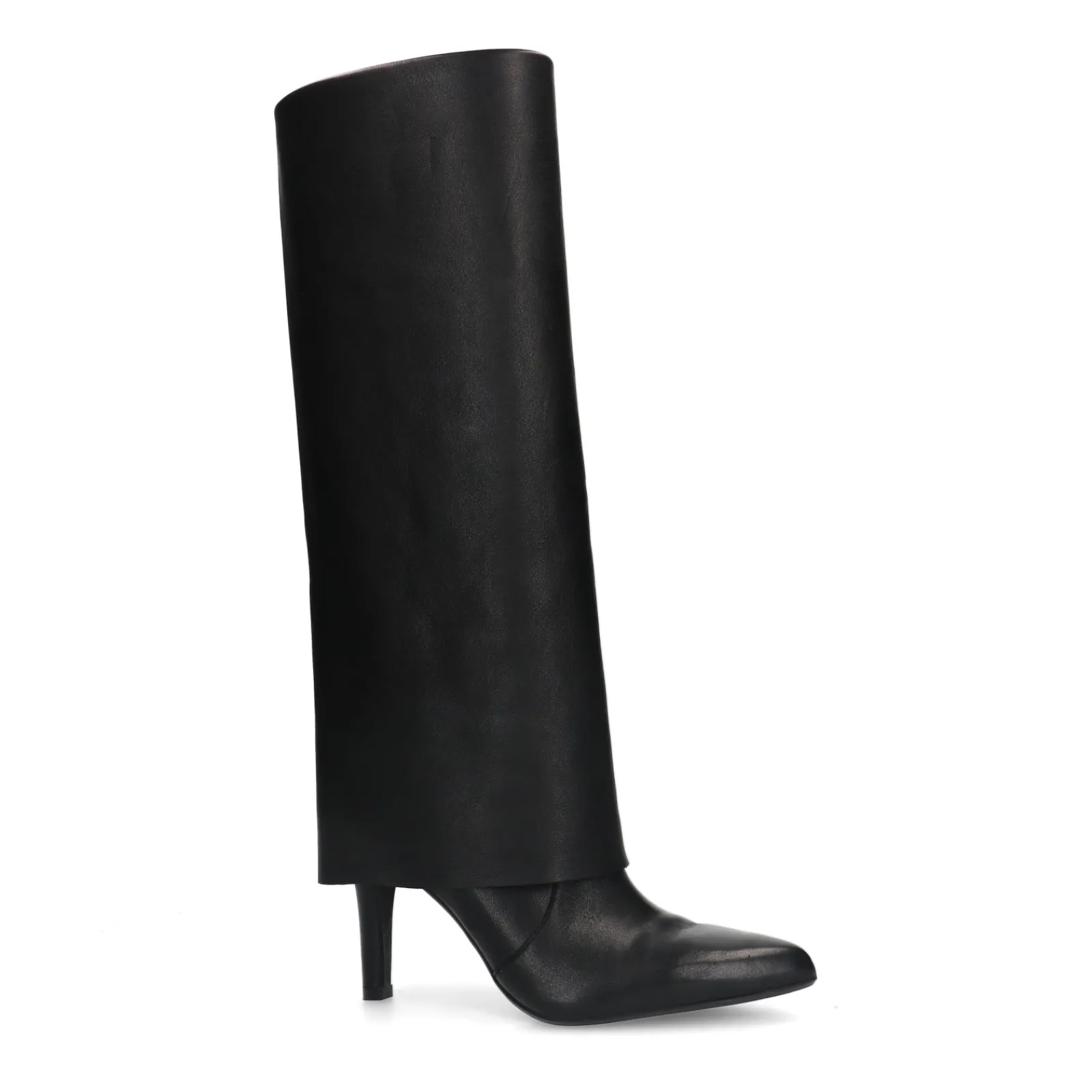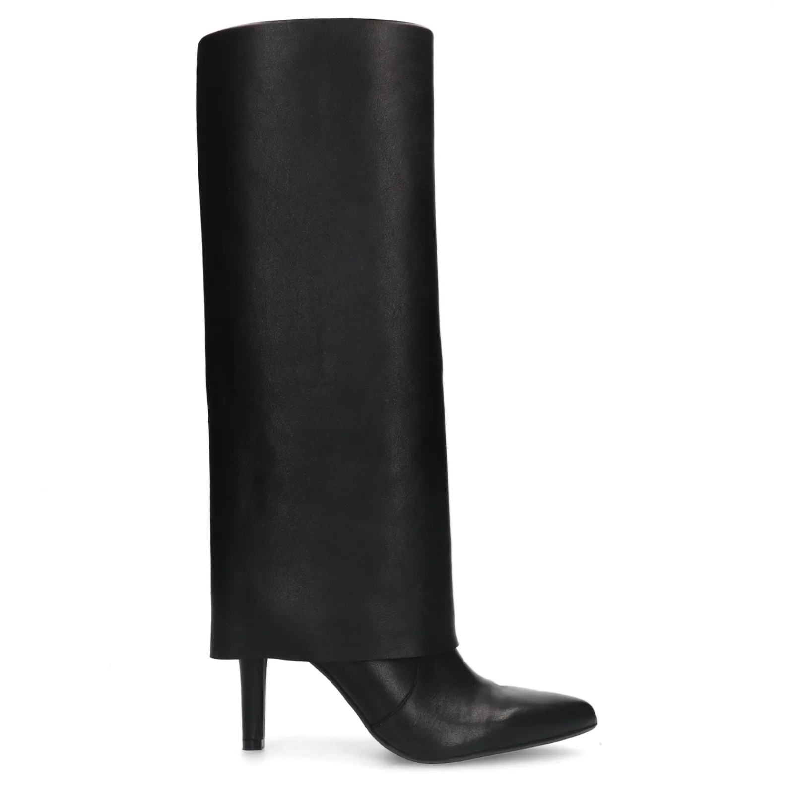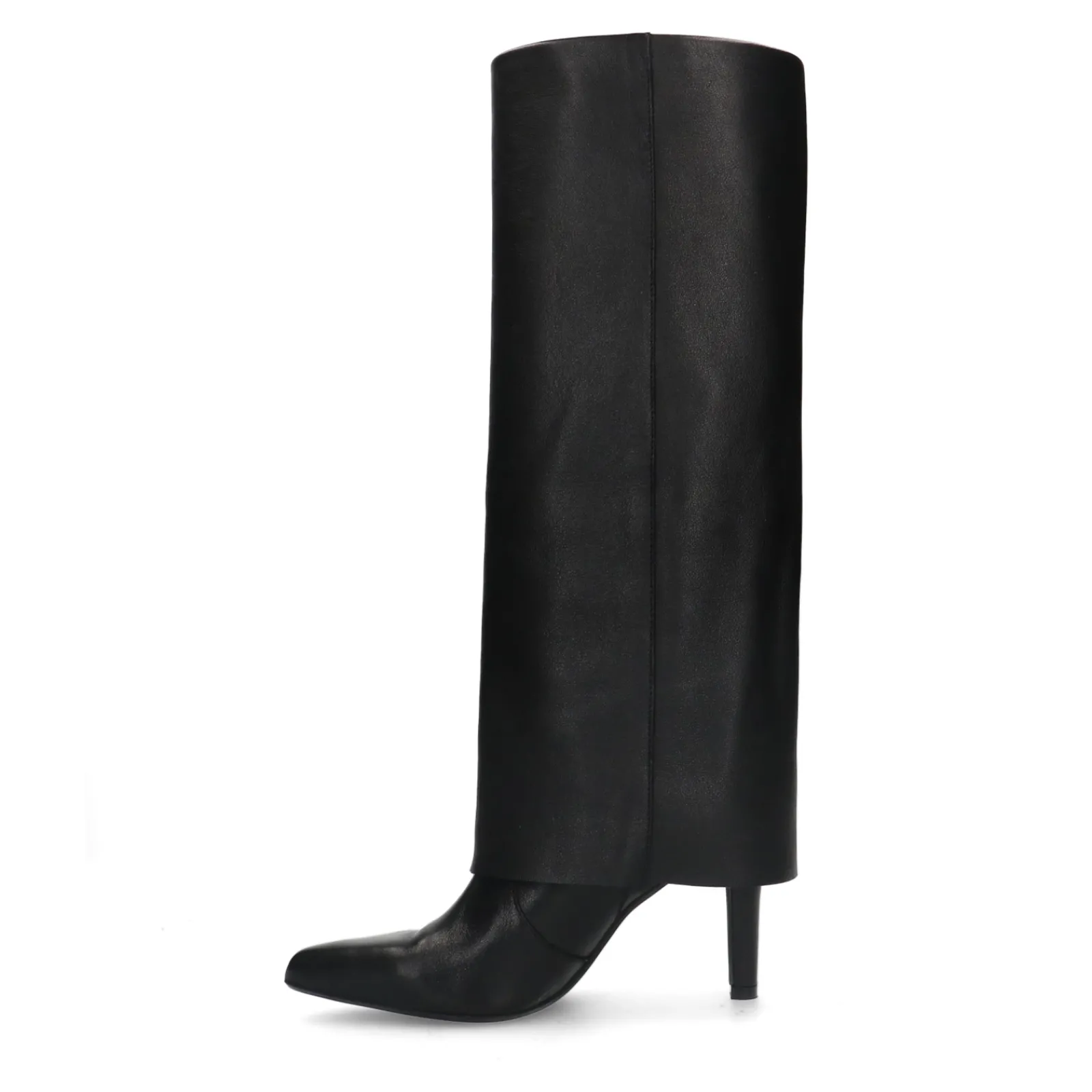 Deze Zwarte Leren Kniehoge Stiletto Boots Met Flap Van Sacha Hebben Een High Fashion Feeling! De Boots Zijn Geheel Gemaakt Van Leer En Hebben Een Omgevouwen Design. De Hoge Instaplaarzen Hebben Een Hak Van 9 Cm, Een Puntige Neus, Een Schachthoogte Van 40 Cm En Een Schachtomtrek Van 38 Cm. Maak Gebruik Van De Juiste Onderhoudsproducten.