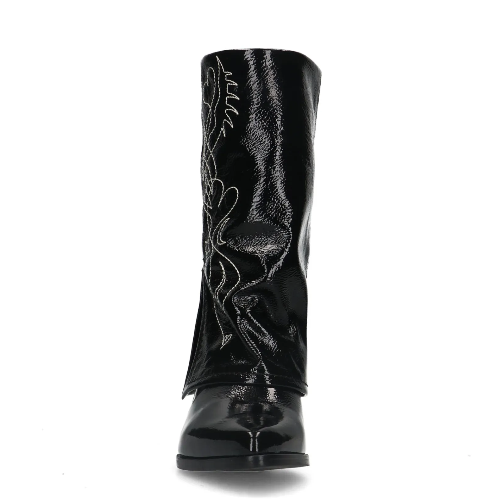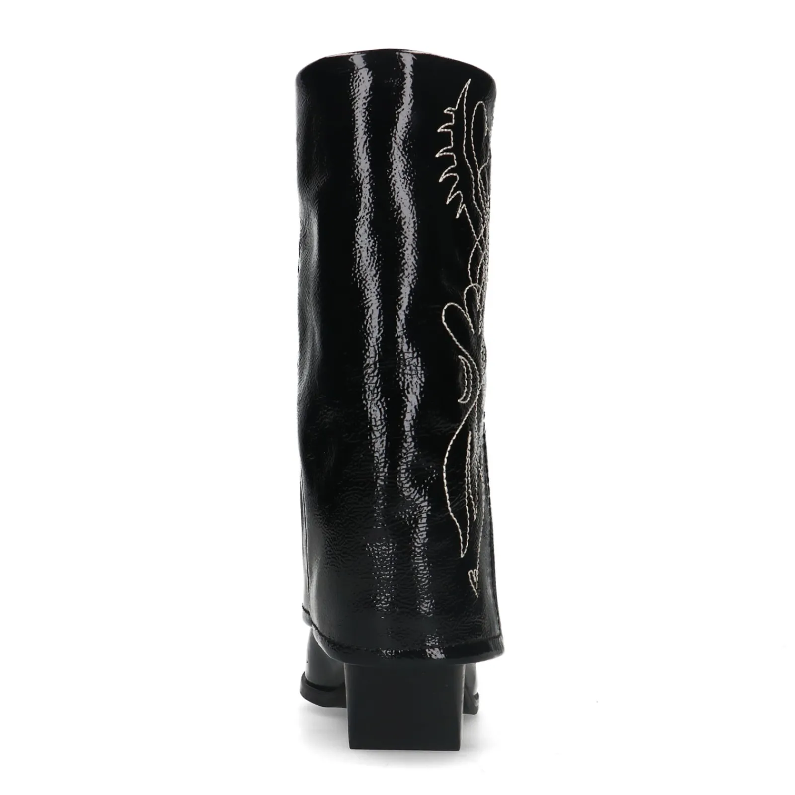 Deze Zwarte Lakleren Western Enkelboots Van Sacha Hebben Een Uniek Detail. De Omgevouwen Flap Creeert Een Afzak-Effect. De Laarzen Hebben Een Puntige Neus En Een Hak Met Een Hoogte Van 7 Cm. De Schachthoogte Is 22 Cm En De Schachtomtrek Meet 35 Cm. De Buitenkant Van De Enkellaarsjes Is Gemaakt Van Leer En Heeft Een Gaaf Design Met Witte Sierstiksels. Maak Gebruik Van De Juiste Onderhoudsproducten!
