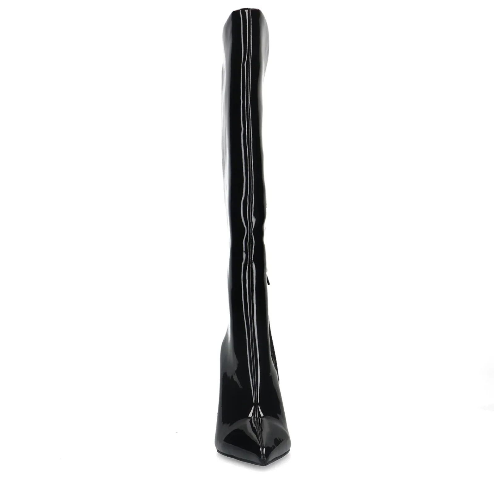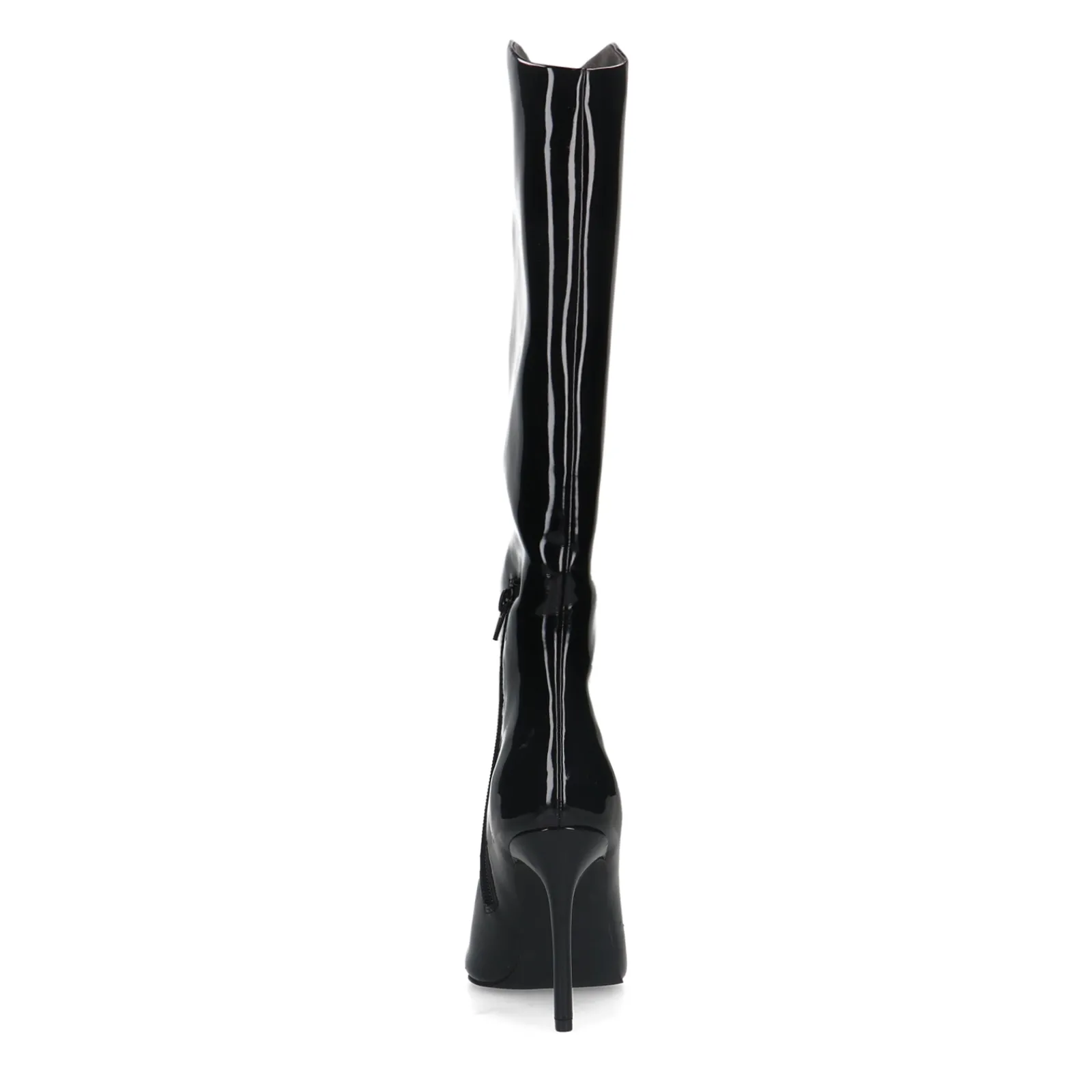 Hoge Zwarte Boots In Een Laklook Met Naaldhak Van Sacha. De Sleek Boots Hebben Een Schuine Afsnede Aan De Bovenzijde Van De Schacht En Een Korte Rits Aan De Binnenzijde. De Schachthoogte Meet 35 Cm, De Schachtomtrek Is 40 Cm En De Naalhak Heeft Een Hoogte Van 10 Cm. Maak Gebruik Van De Juiste Onderhoudsproducten.