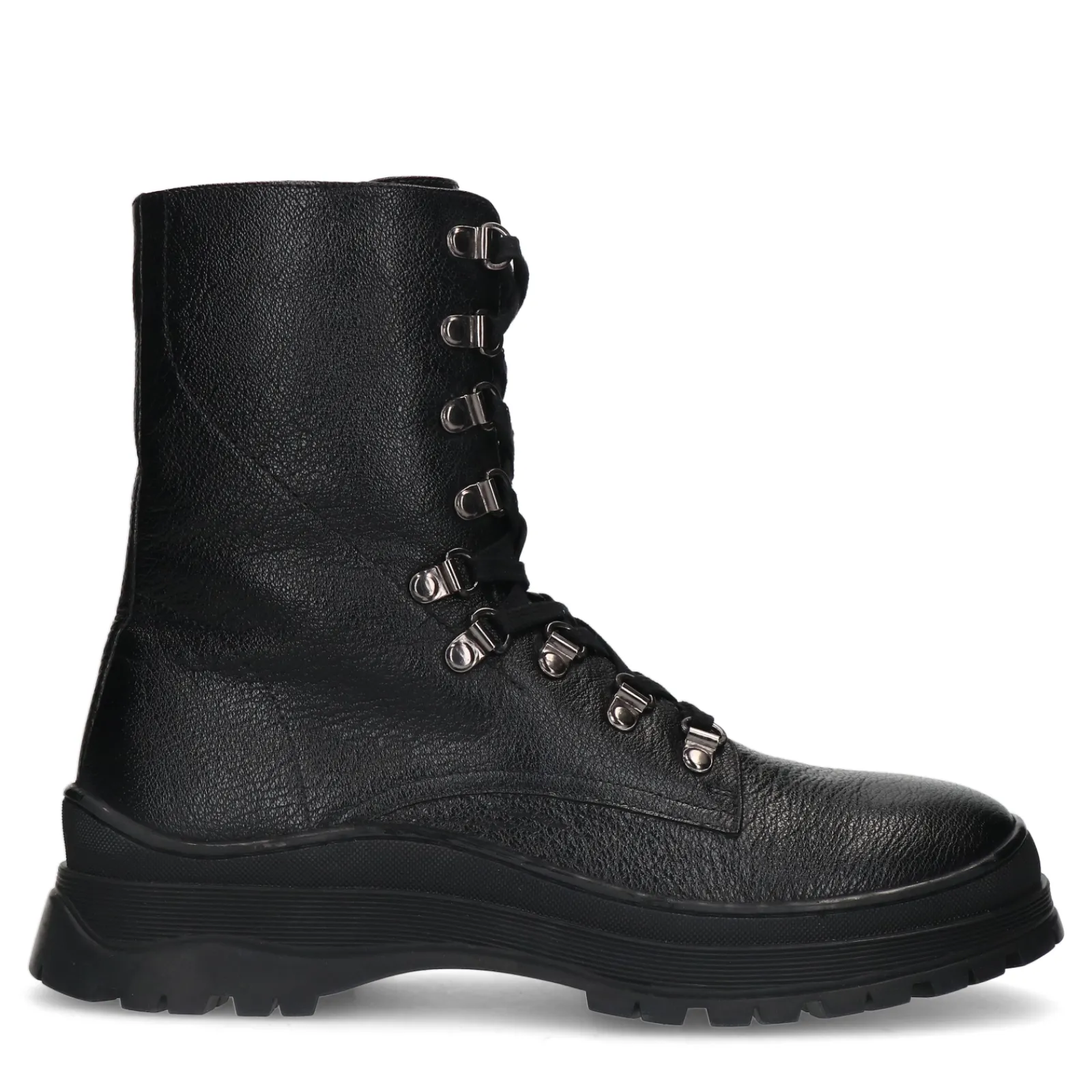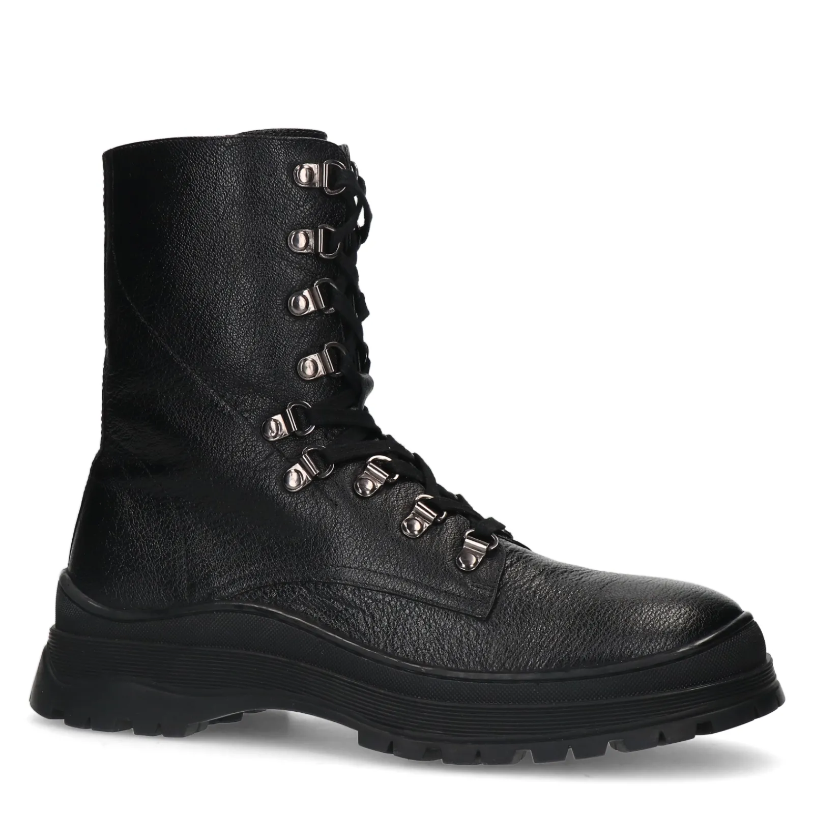 Deze Zwarte Leren Hoge Veterboots Van Sacha Hebben Een Stoer Design. De Veterboots Zijn Aan De Buitenzijde Gemaakt Van Leer, Sluiten Middels 9 Veterogen Aan Beide Zijde En Een Rits Aan De Binnenzijde. De Laarzen Hebben Een Zooldikte Van 3 Cm. Hierbij Hoort Een Schachthoogte Van 17 Cm En Een Schachtomtrek Van 31 Cm. Onderhoud De Veterboots Met De Juiste Onderhoudsproducten!