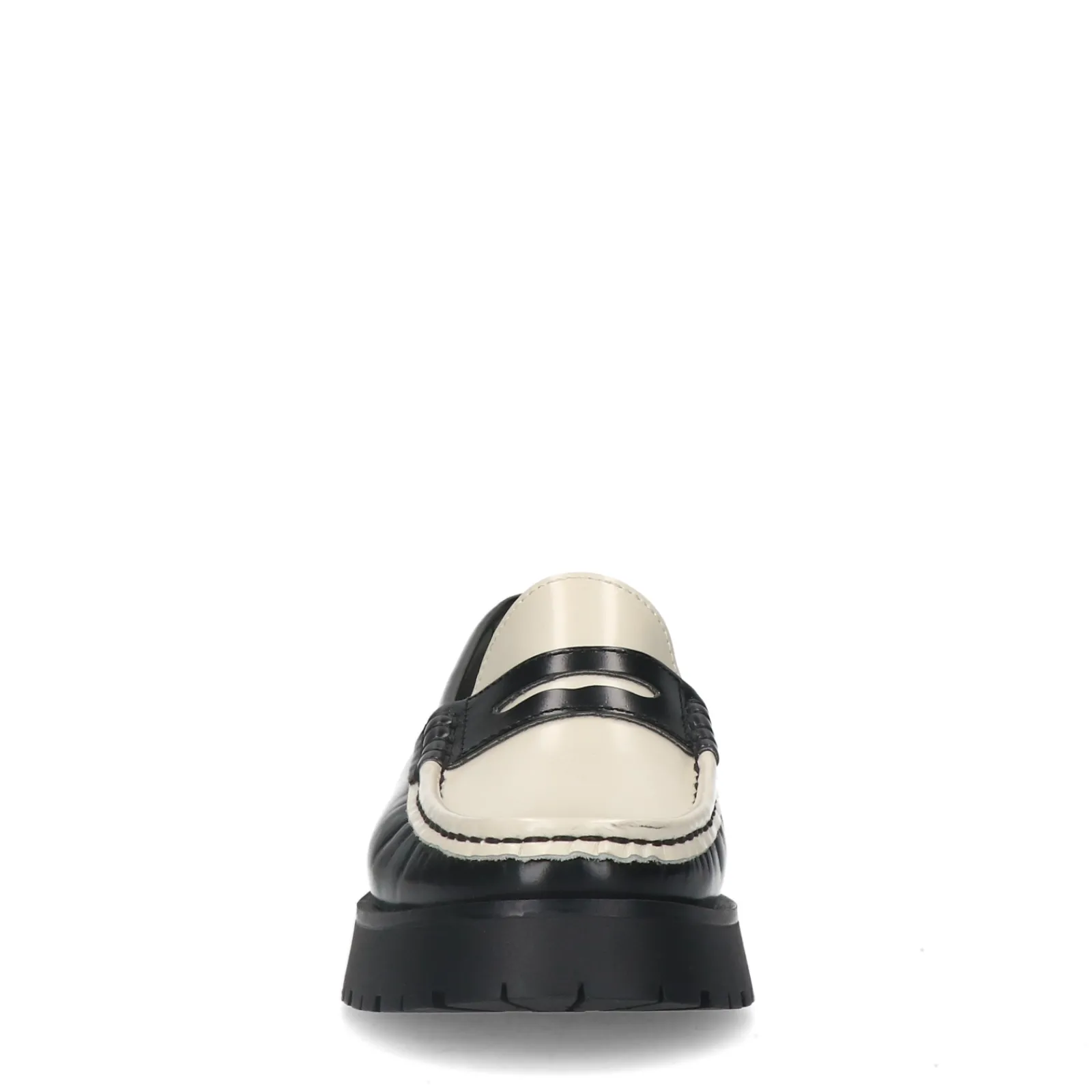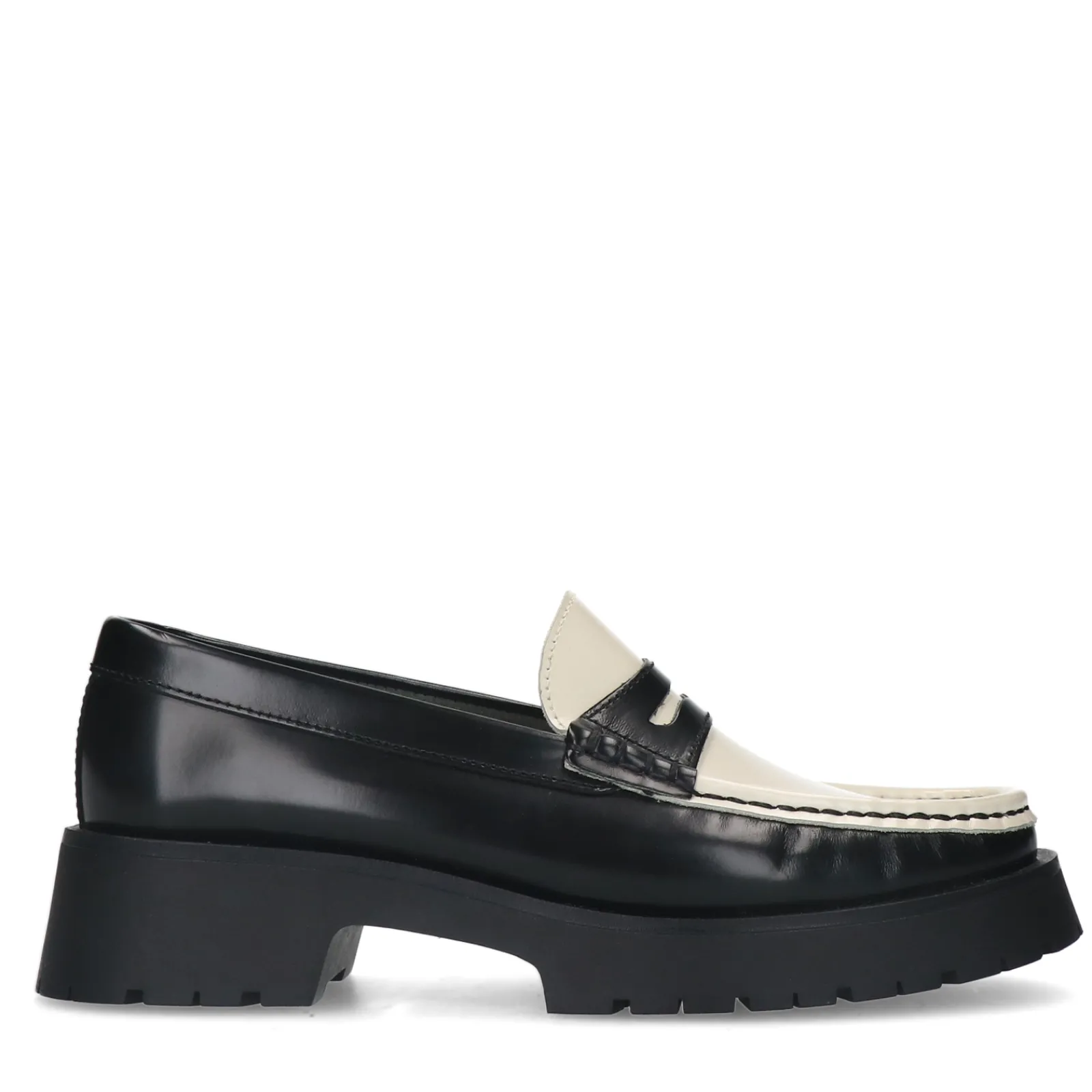 Chunky Leren Loafers Van Sacha Met Opvallende Plateau Zool. De Loafers Hebben Een Penny Detail Op De Wreef Van De Voet, Een Mix Tussen Zwarte En Witte Details En Een Plateau Zool Van 2 Cm Dik. De Hak Van De Dames Instappers Heeft Een Hoogte Van 4 Cm. De Binnenzijde Van De Loafers Is Gemaakt Van Suede. Maak Gebruik Van De Juiste Onderhoudsproducten!