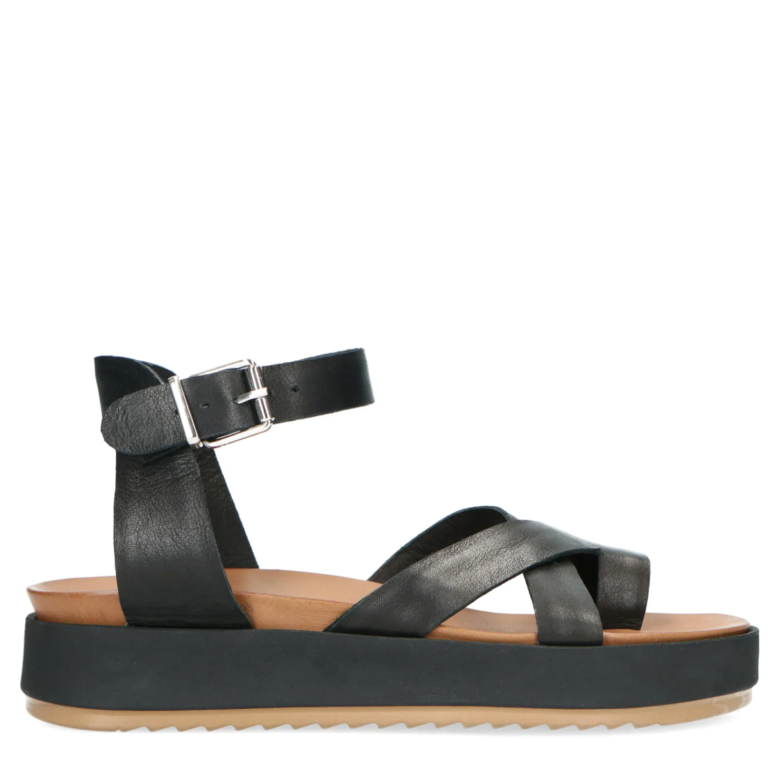 Zwarte Sandalen Uit De Women Essentials Collectie Van Sacha. De Slippers Zijn Volledig Gemaakt Van Leer, Wat Zorgt Voor Een Hoog Loopcomfort. De Sandalen Hebben Een Enkelbandje Met Een Zilverkleurige Gesp En Een Plateauzool Van 3 Cm Hoog. Combineer Dit Item Met Een Lichte Jeans Of Een Maxi Dress. Maak Gebruik Van De Juiste Onderhoudsproducten.