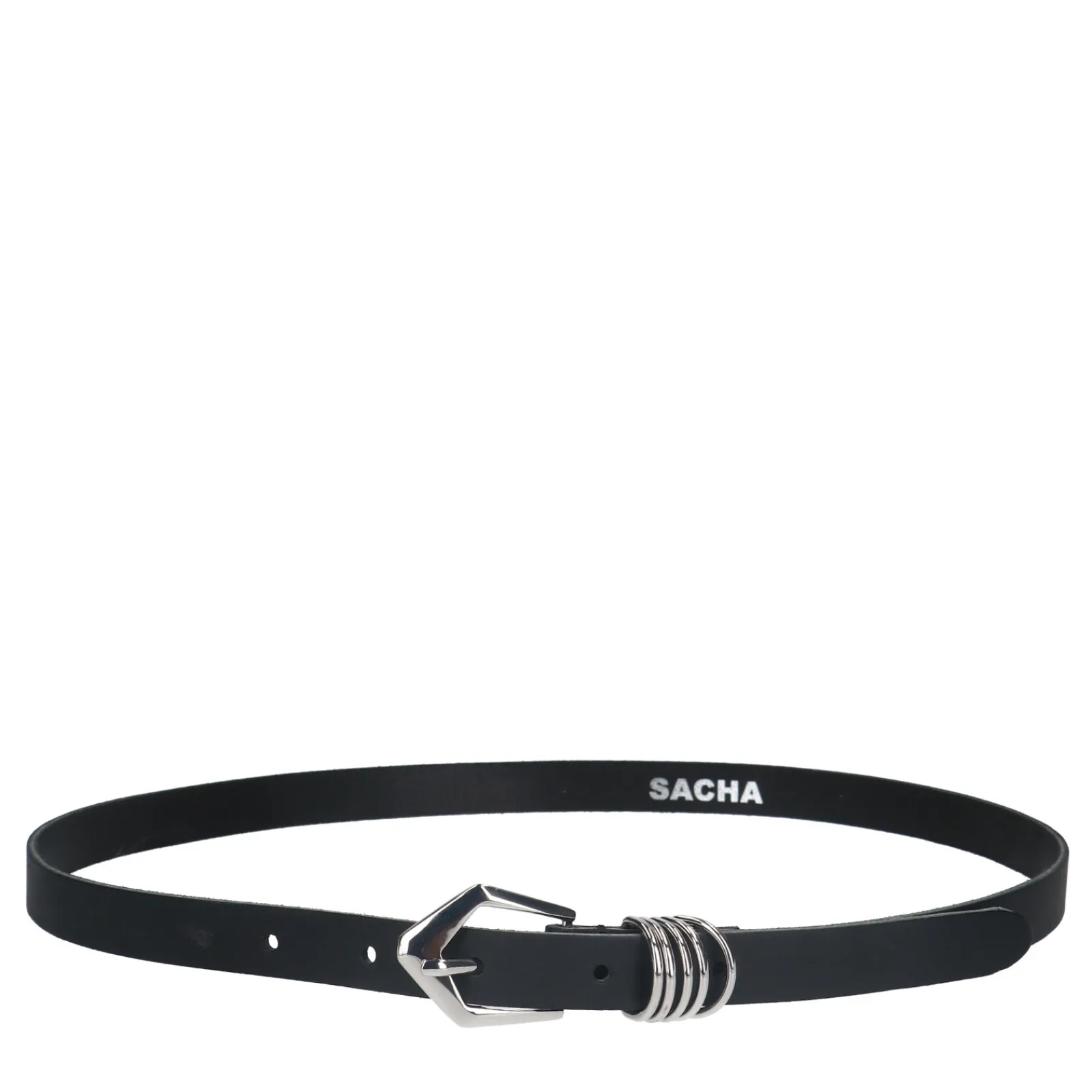 Zwarte Leren Smalle Riem Van Sacha. De Riem Sluit Middels Een Zilverkleurige Gesp Met Zilverkleurige Ringetjes Als Detail. De Riem Heeft Een Breedte Van 2 Cm.