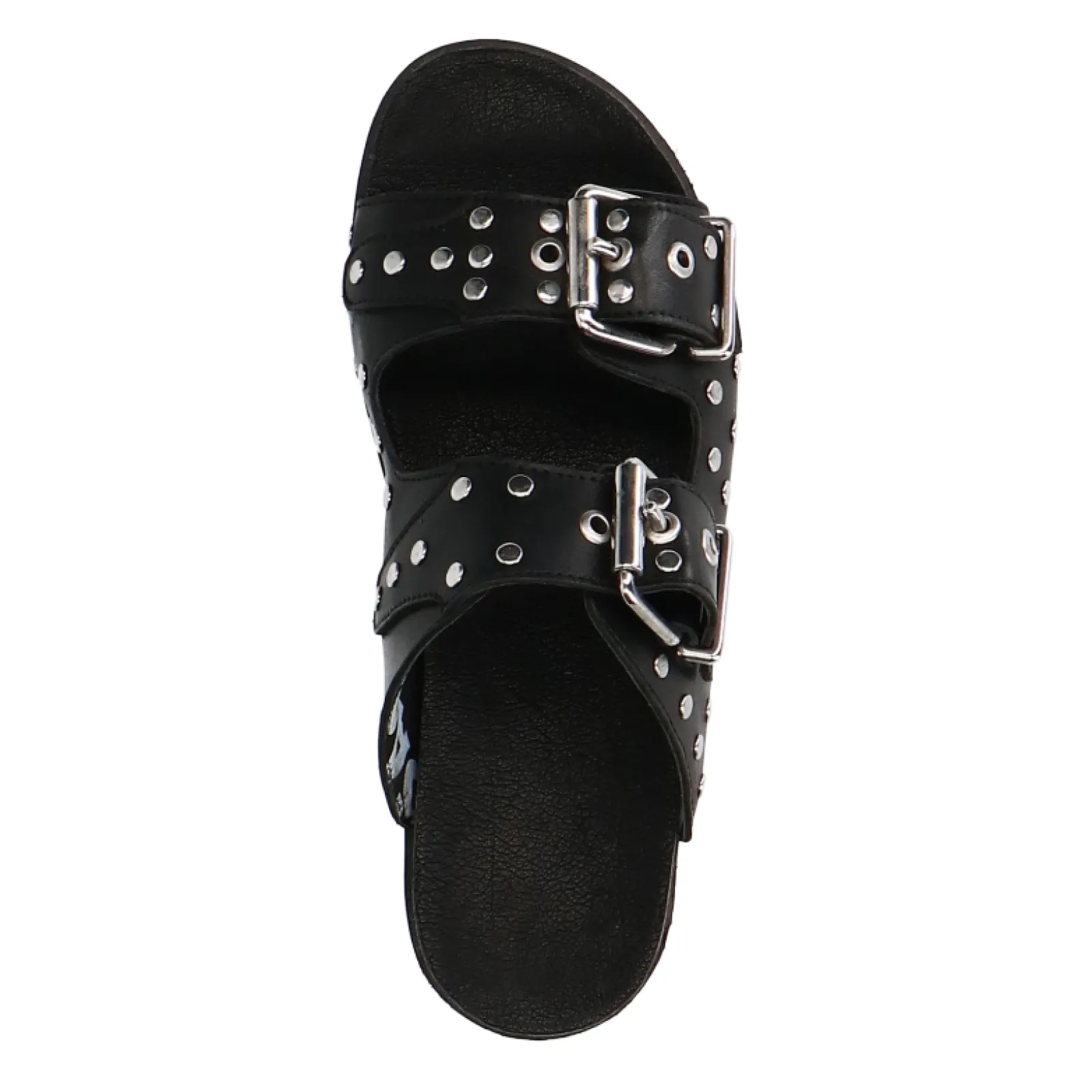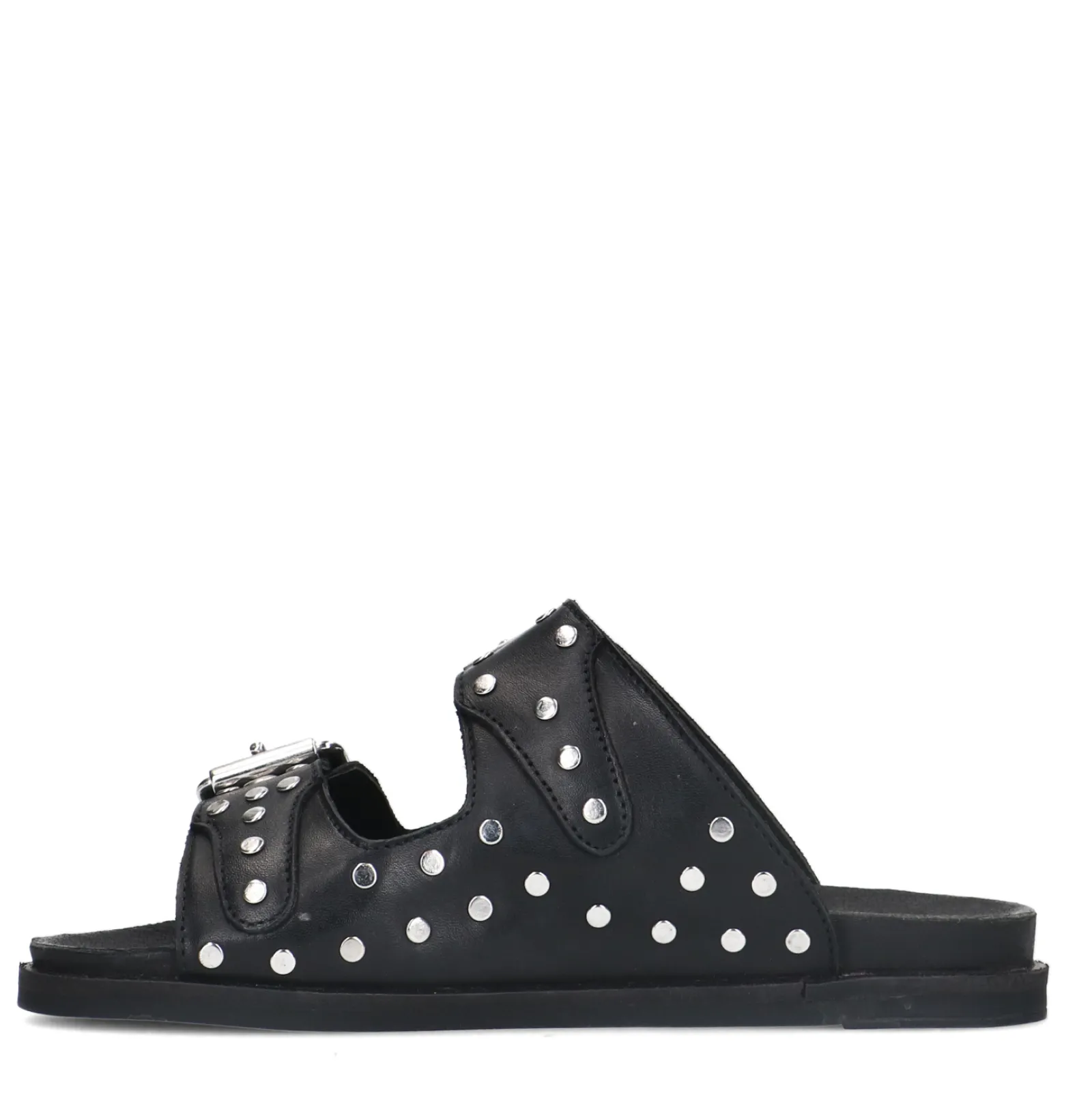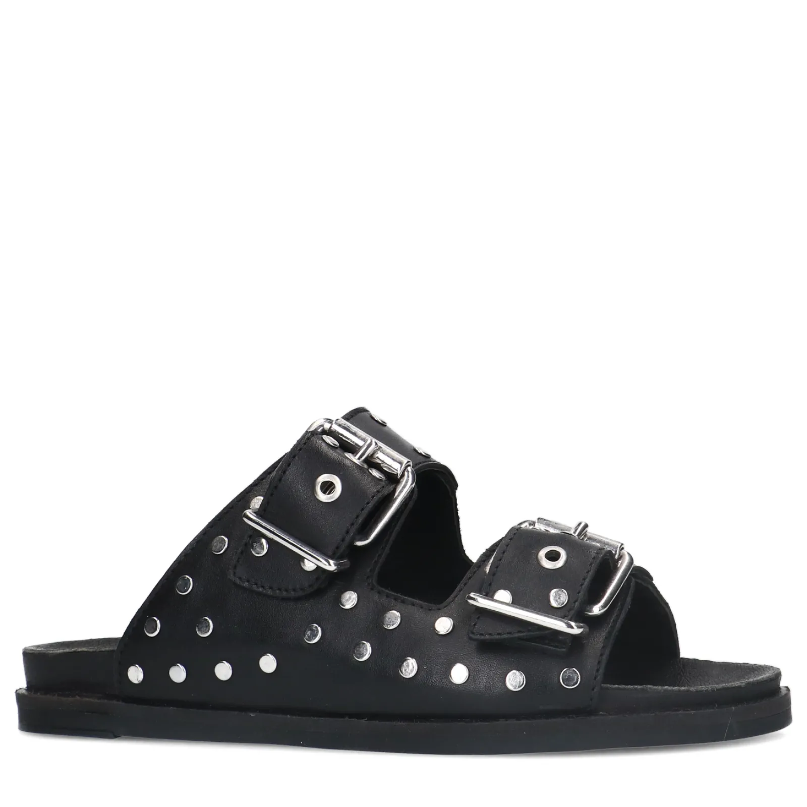 Deze Chunky Slip On Sandalen Van Sacha Geven Jouw Look Een Stoere Twist. De Slippers Hebben Twee Brede Banden Met Gesp, Zilverkleurige Studs En Een Verhoogde Zool Van 3 Cm. De Zool Zorgt Voor Een Comfortabele Pasvorm. Zowel De Binnen- Als Buitenkant Zijn Gemaakt Van Leer. Maak Gebruik Van De Juiste Onderhoudsproducten!