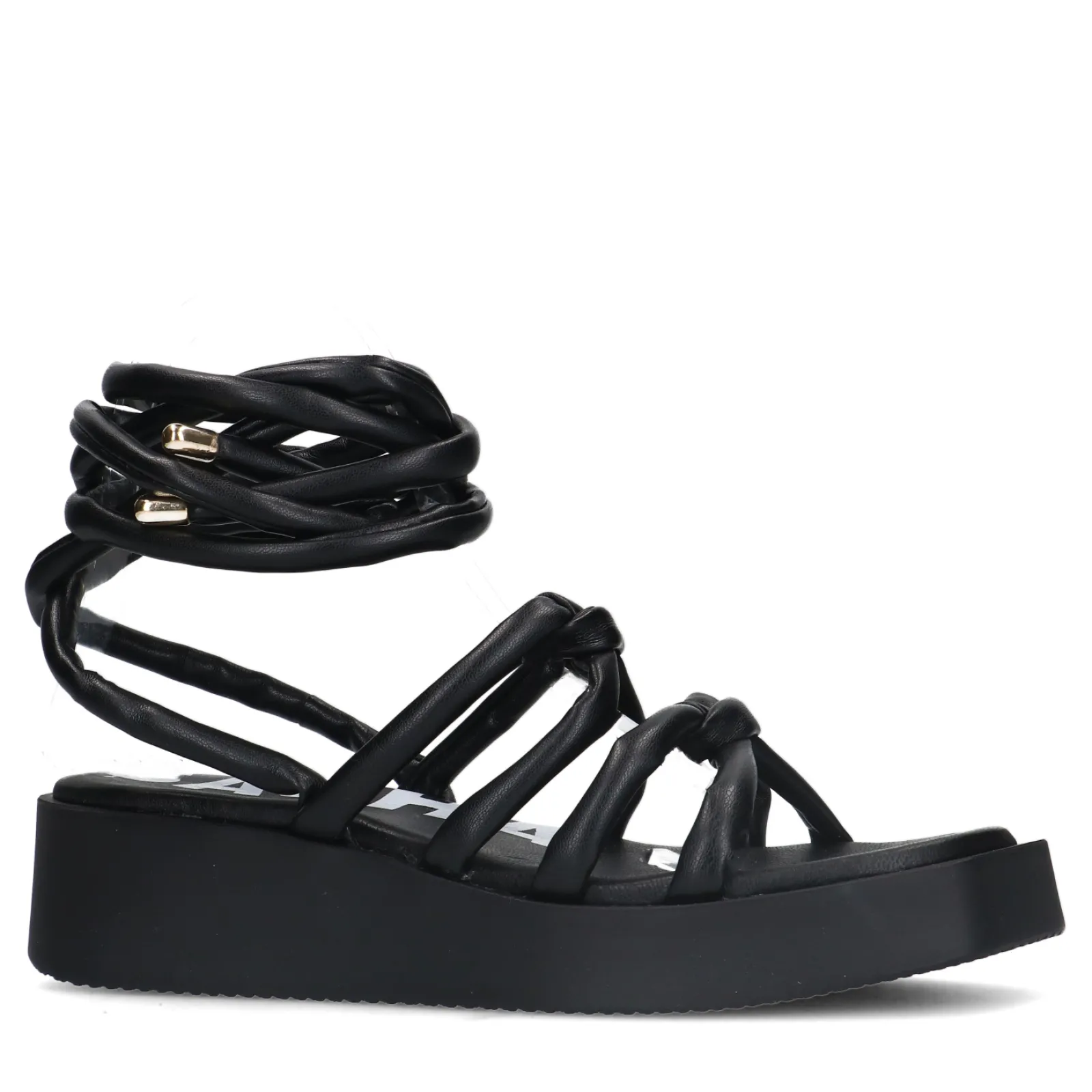 Deze Zwarte Sandalen Van Sacha Hebben Twee Unieke Eigenschappen: Een Edgy Zwarte Plateau Zool En Lange Strikveters! De Sandalen Hebben Een Zooldikte Van 2 Cm En Een Lichte Verhoging In De Hak Van 4 Cm. De Puffy Strikveters Met Goudkleurige Details Aan Het Uiteinde Zijn Zowel Om De Enkel Te Strikken, Als Om Jouw Onderbeen. Maak Gebruik Van De Juiste Onderhoudsproducten!