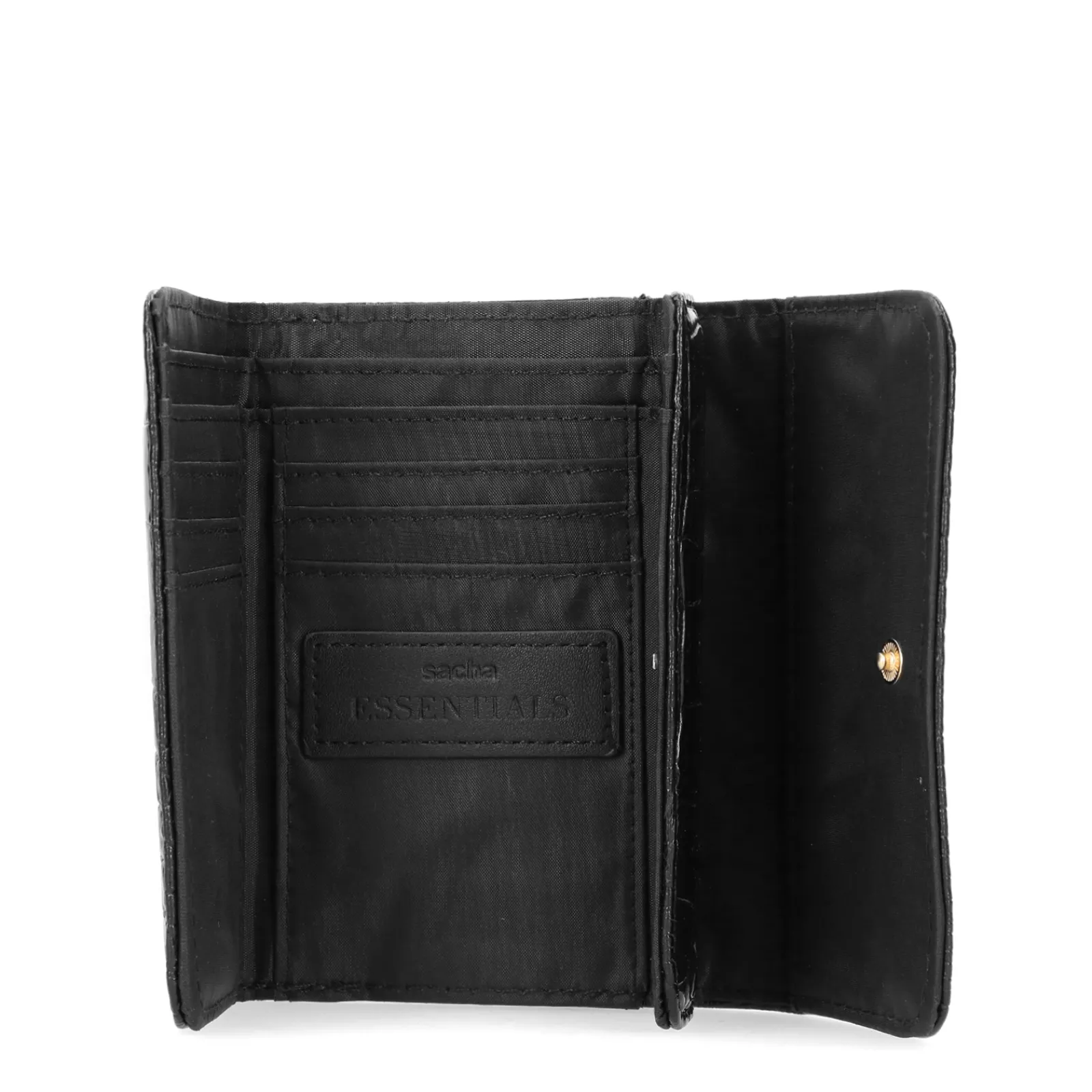 Animal Print Is Hot! Deze Zwarte Portemonnee Met Crocoprint Uit De Bag Essentials Collectie Van Sacha Mag Dan Ook Niet Ontbreken In Jouw Handtas! De Portemonee Heeft Twee Grote Vakken Die Sluiten Met Een Drukker. Een Van De Vakken Is Geschikt Voor Briefgeld En 6 Pasjes. In Het Andere Vak Is Ruimte Voor Muntgeld In Een Klein Ritsvakje. Aan De Achterzijde Van De Portemonnee Vind Je Een Insteekvak Waar Je Bijvoorbeeld Bonnetjes Kunt Bewaren. Ruimte Genoeg Dus! De Afmetingen Van De Portemonnee Zijn 13,5X9X2,5 (Bxhxd) Cm.