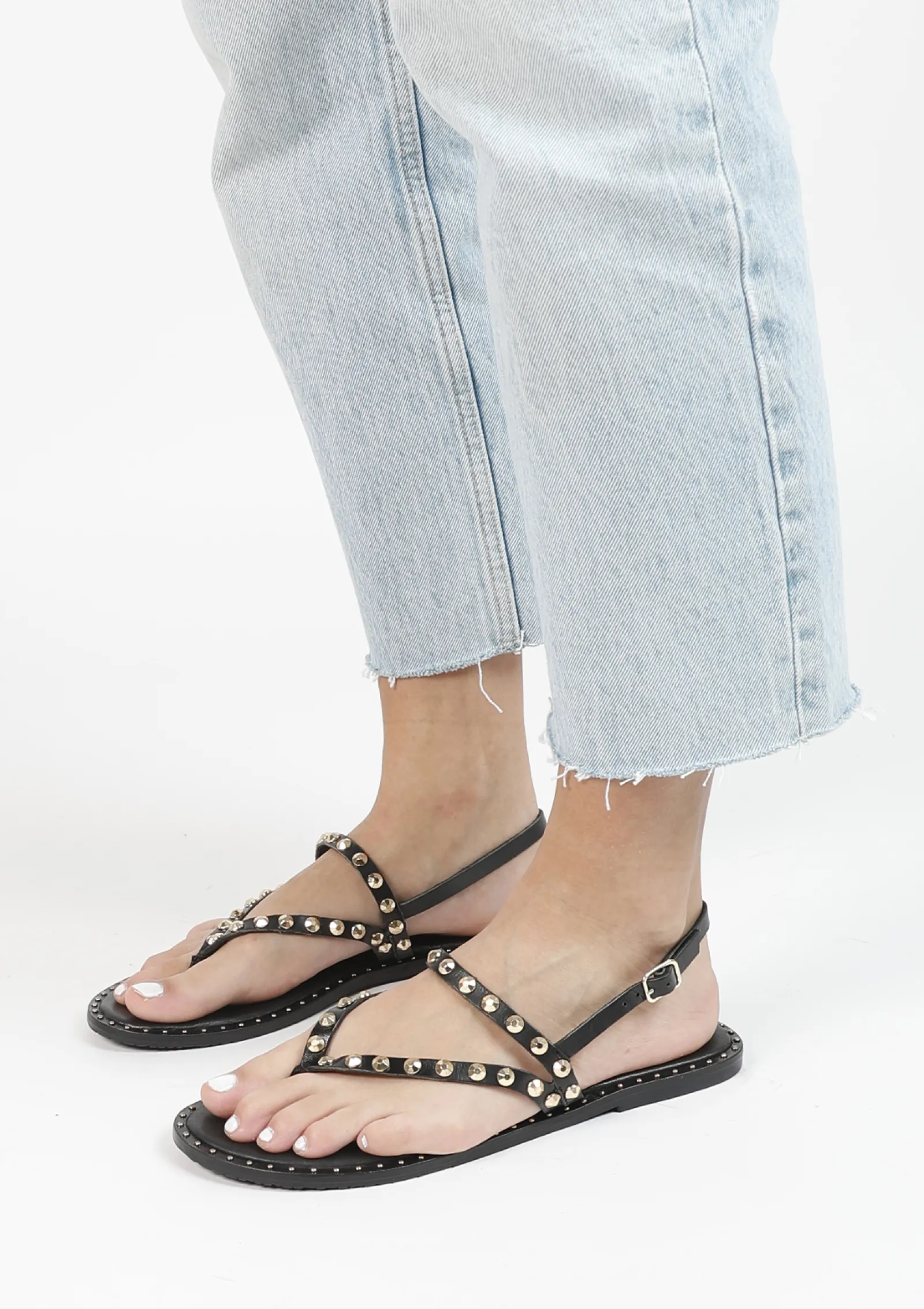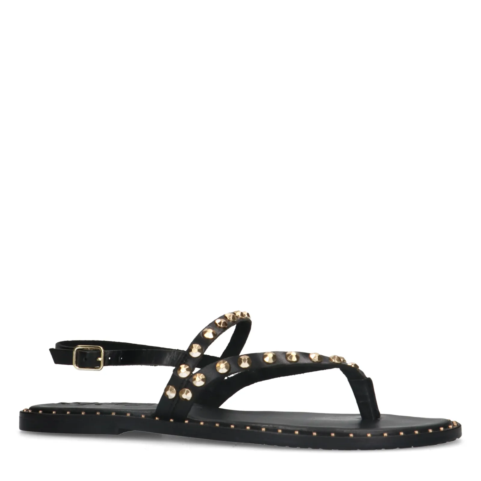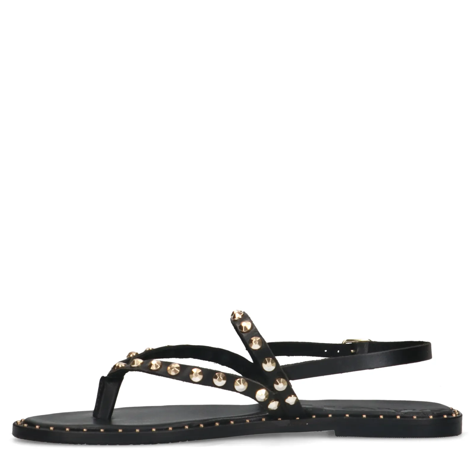 Deze Zwarte Sandalen Van Sacha Zijn Een Echte Musthave Deze Zomer! De Goudkleurige Studs Over De Bandjes Gecombineerd Met De Kleine Studs Rond De Zool Geven De Sandalen Een Extra Touch. De Platte Sandalen Sluiten Middels Een Enkelbandje Met Goudkleurige Gesp. De Sandalen Zijn Geheel Gemaakt Van Leer En Hebben Een Zooldikte Van 1 Cm. Maak Gebruik Van De Juiste Onderhoudsproducten Om Jouw Statement Sandalen Te Verzorgen!