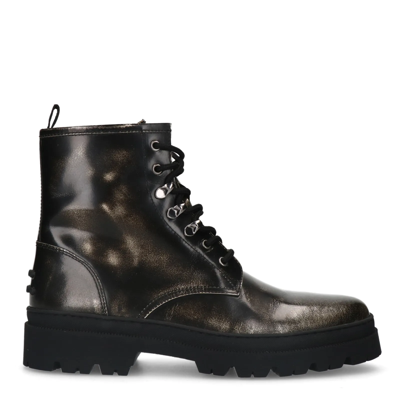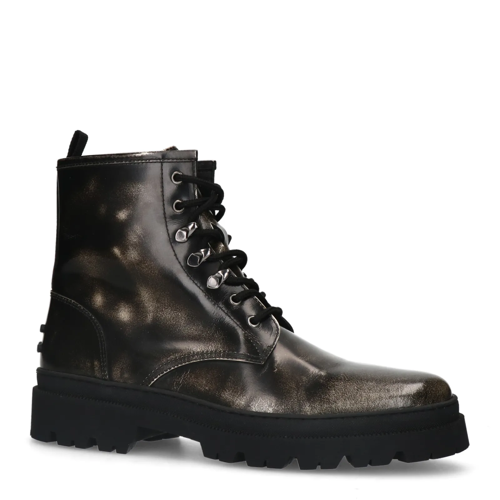 Deze Zwarte Veterboots Hebben Een Uniek Effect. De Silverwashing Aan De Gladleren Buitenzijde Zorgt Voor Een Ruwe Look. De Veterlaarzen Hebben 7 Zilverkleurige Veterogen Aan Iedere Zijde , Een Zool Van 2 Cm En Een Lage Hak Van 3 Cm. Aan De Achterzijde Heeft De Hak 7 Kleine Rubberen Details. De Heren Veterboots Hebben Een Schachthoogte Van 15 Cm En Een Schachtomtrek Van 28 Cm. Maak Gebruik Van De Juiste Onderhoudsproducten.